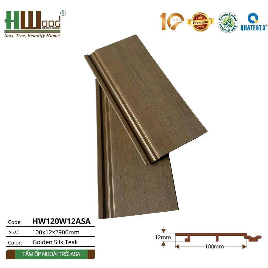 Tấm ốp gỗ nhựa phủ ASA này có bốn lựa chọn màu sắc đẹp mắt bao gồm Ancient Wood, Golden Silk Teak, Walnut, Taxus Chinensis, Bio Teak, Golden Teak, mang đến nhiều phương án trang trí đa dạng cho không gian ngoại thất. Mỗi tấm có diện tích khoảng 0,29m², giúp khách hàng dễ dàng tính toán số lượng cần thiết cho công trình.