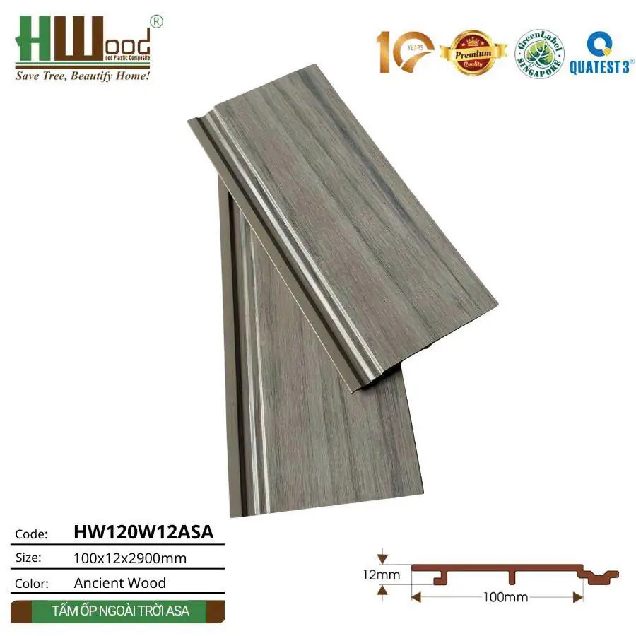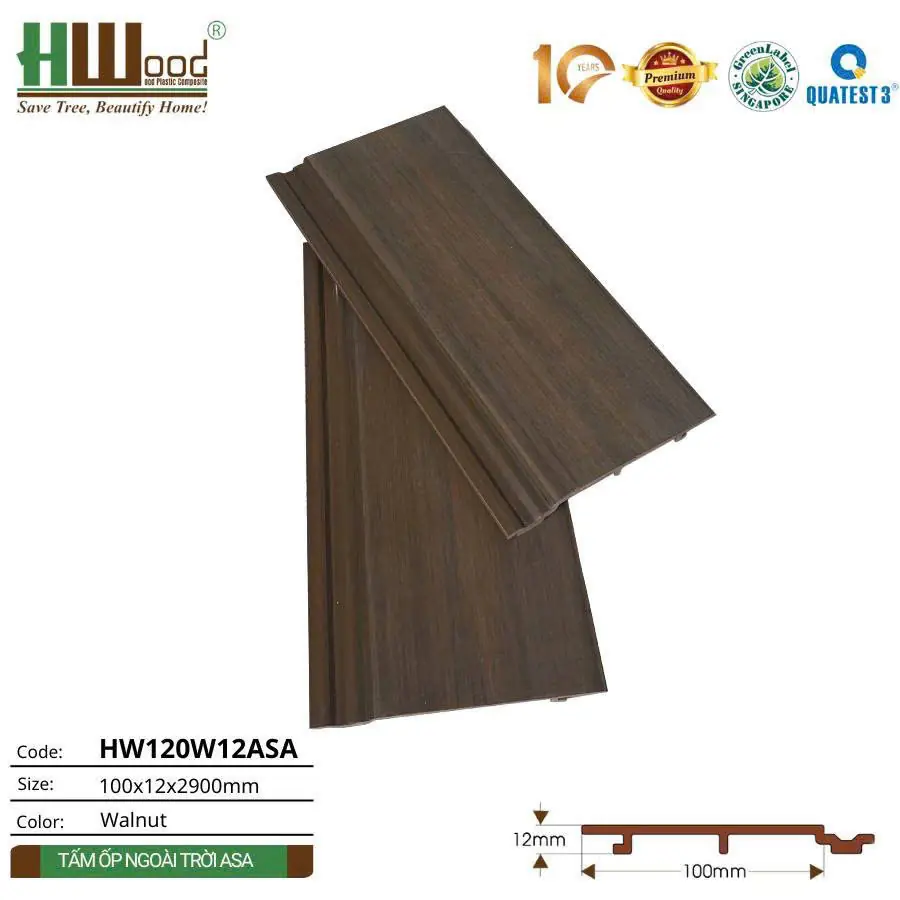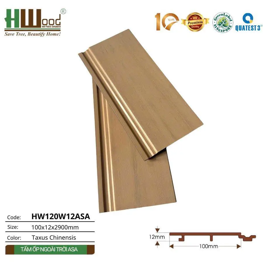 Tấm ốp ngoài trời HW120W12ASA được sản xuất từ chất liệu gỗ nhựa composite cao cấp với kích thước chuẩn 100x12x2900mm. Đặc biệt, sản phẩm được phủ thêm lớp bảo vệ ASA (Acrylonitrile Styrene Acrylate) – vật liệu polymer cao cấp có khả năng chống UV tuyệt đối, giúp tấm ốp bền màu vĩnh viễn trong mọi điều kiện thời tiết khắc nghiệt.